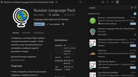В поле поиска ищем Russian Language Pack for Visual Studio Code нажимаем Install